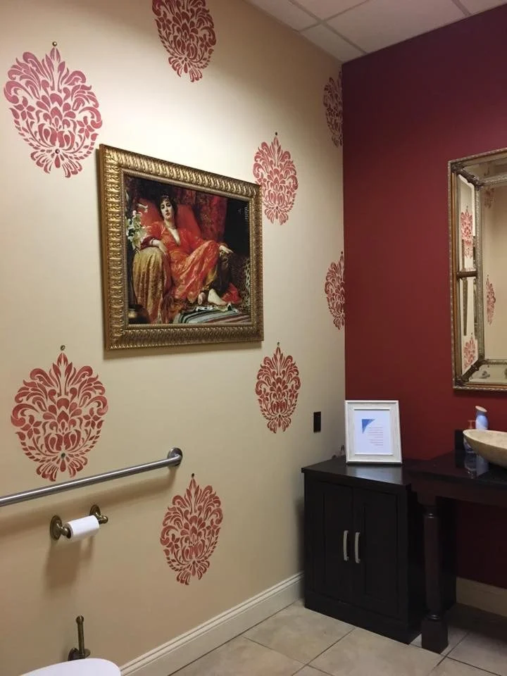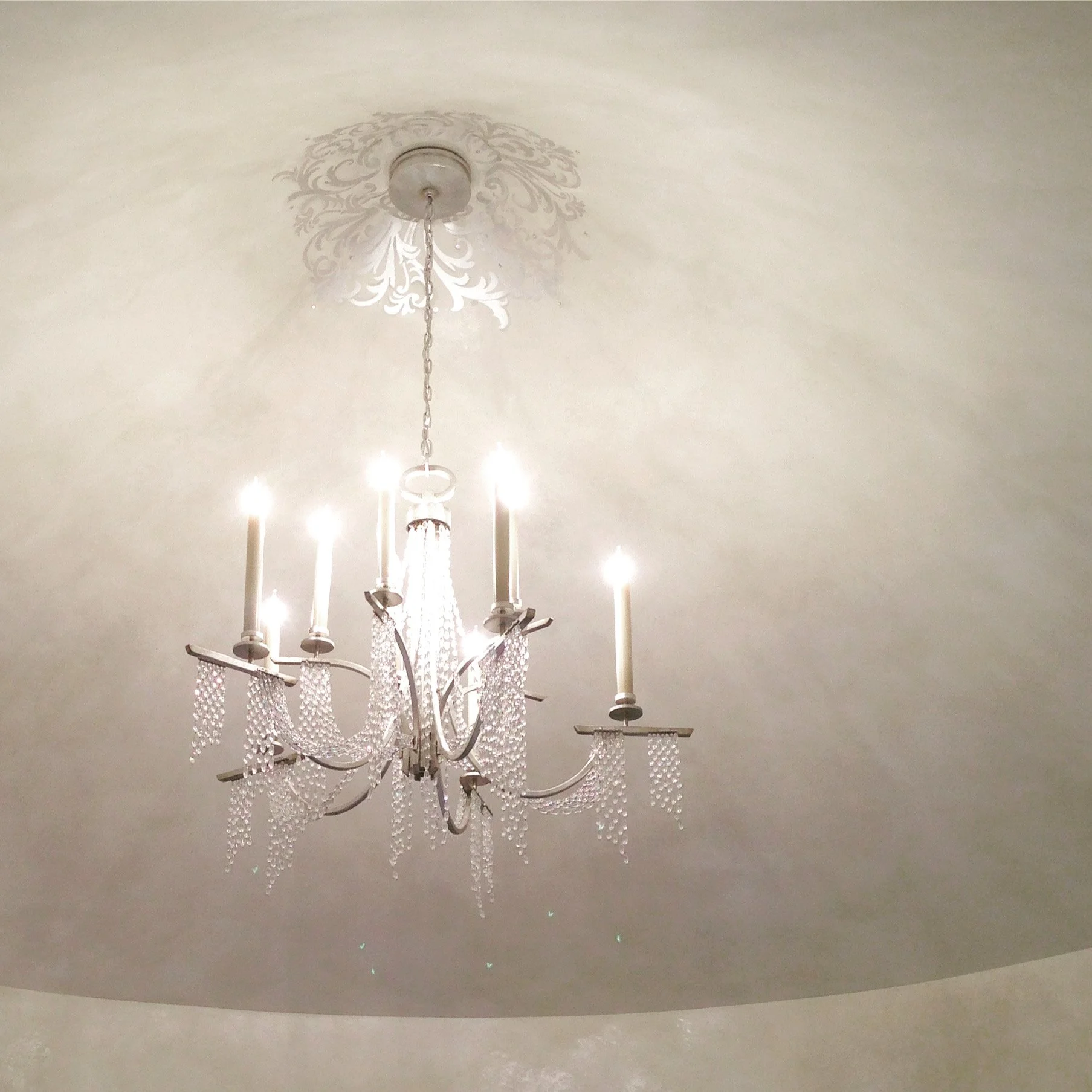 Scrolled Medallion done in silver metallic over pearlized faux finish in master bathroom