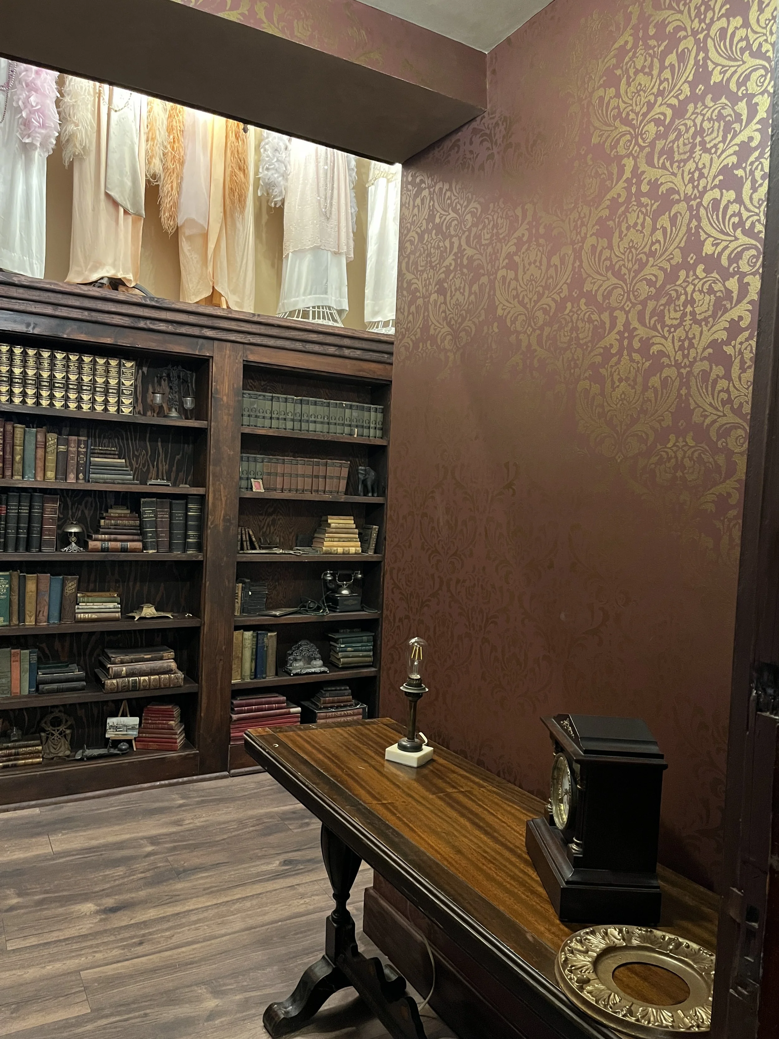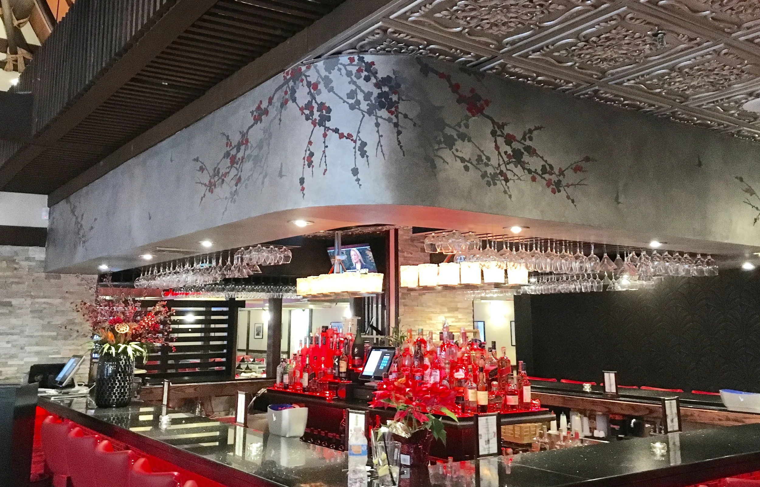 Cherry blossom stencil done in rich burgundy and charcoal hues on silver metallic faux finish in Gasho of Japan restaurant