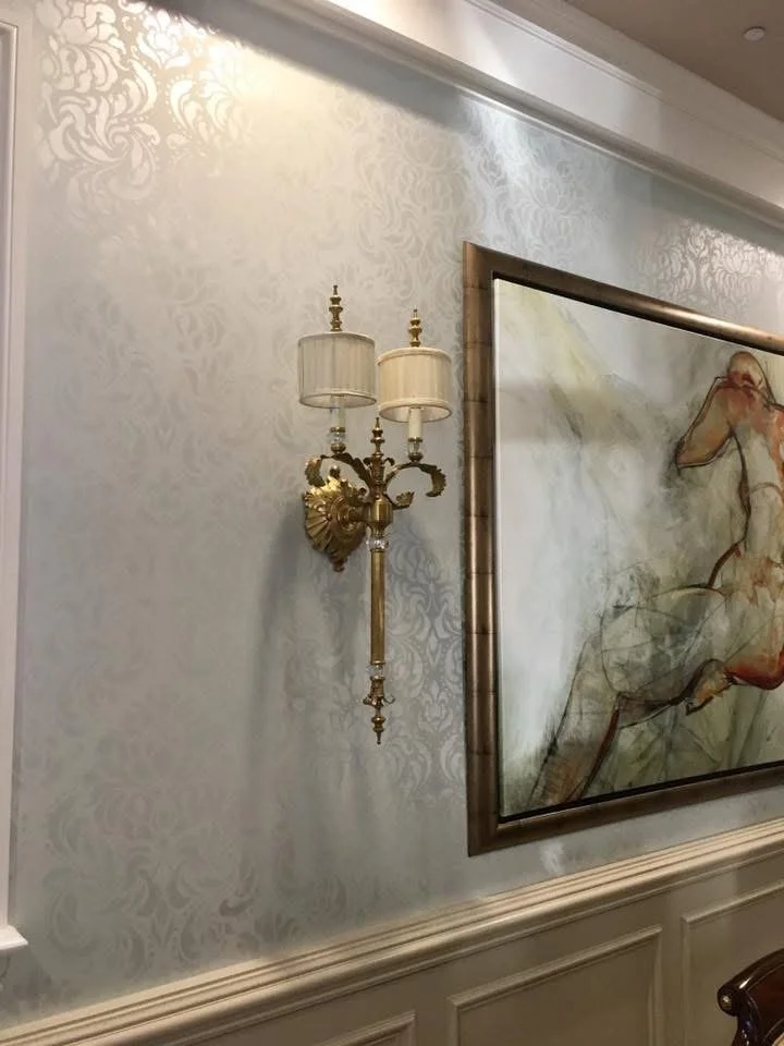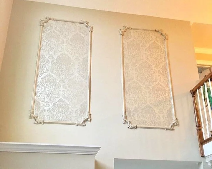 Large damask stencil done in pearlized finish gives the illusion of wallpaper in these gorgeous grand foyer panels