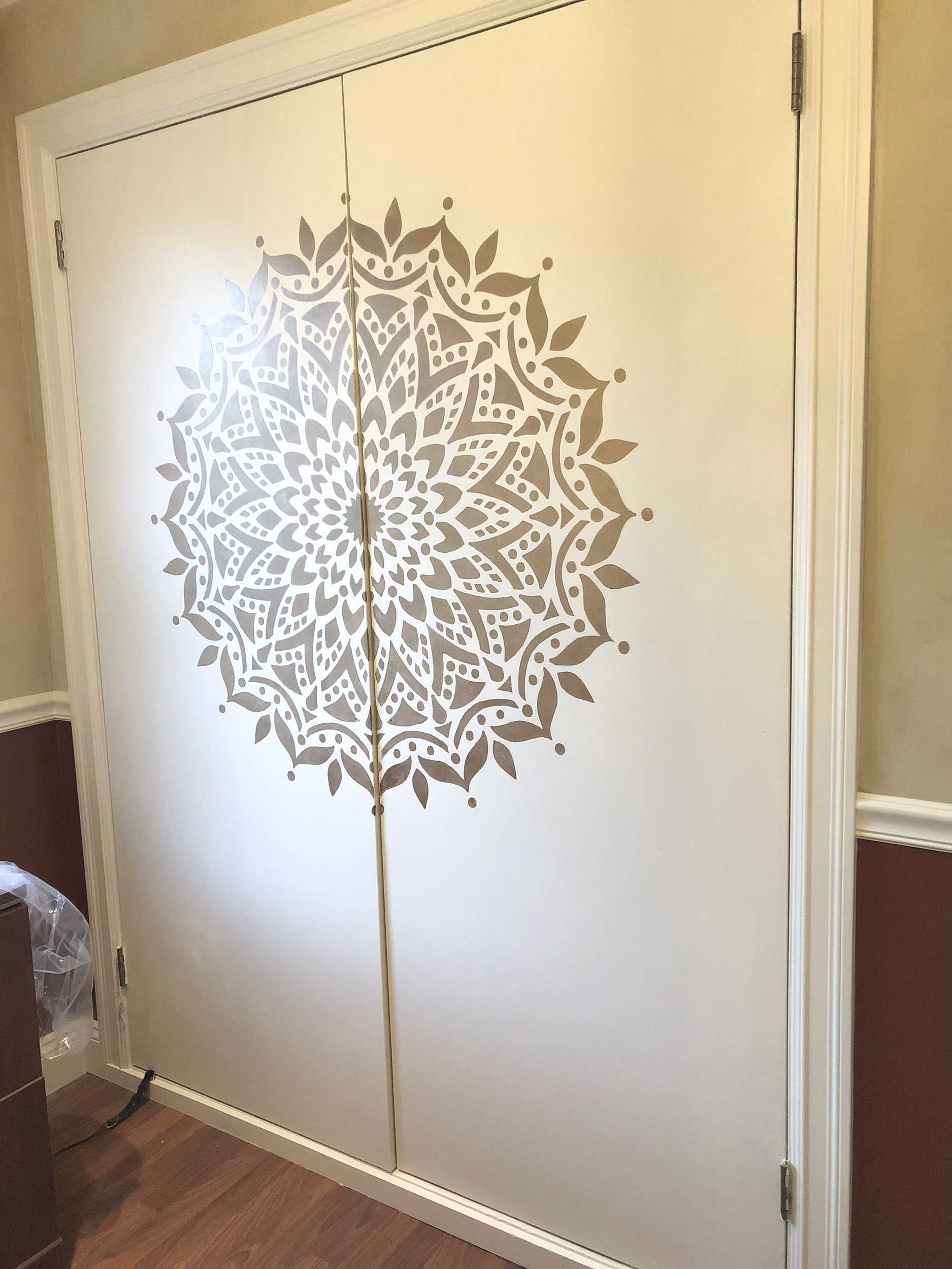 Fun mandala done in bronze metallic finish on closet doors embellished with colored crystal studs