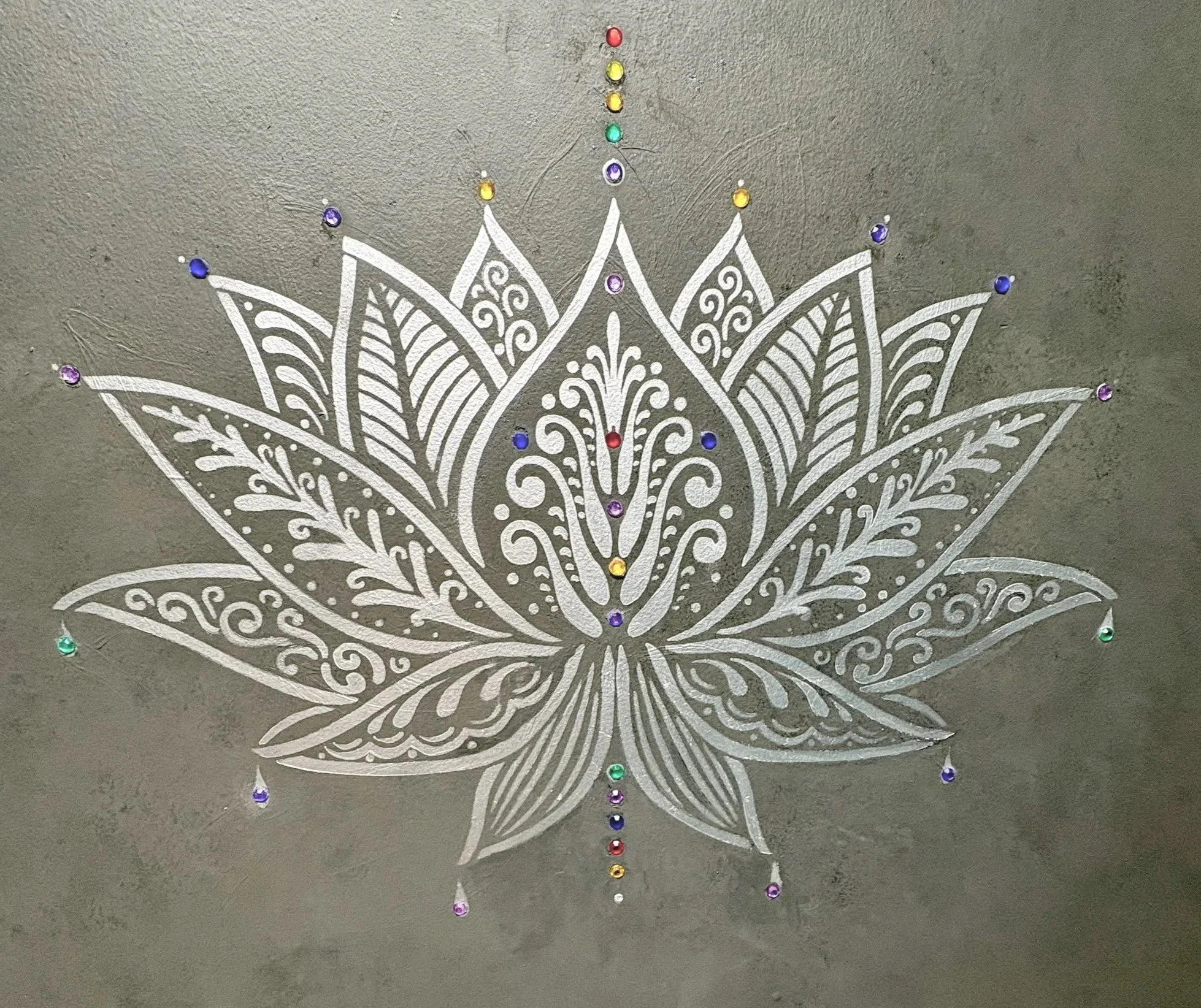 Large Lotus Stencil in Silver Metallic with Rhinestone Embellishments