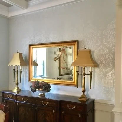 Damask stencil done in gold metallic gives this dining room a rich wallpaper feel