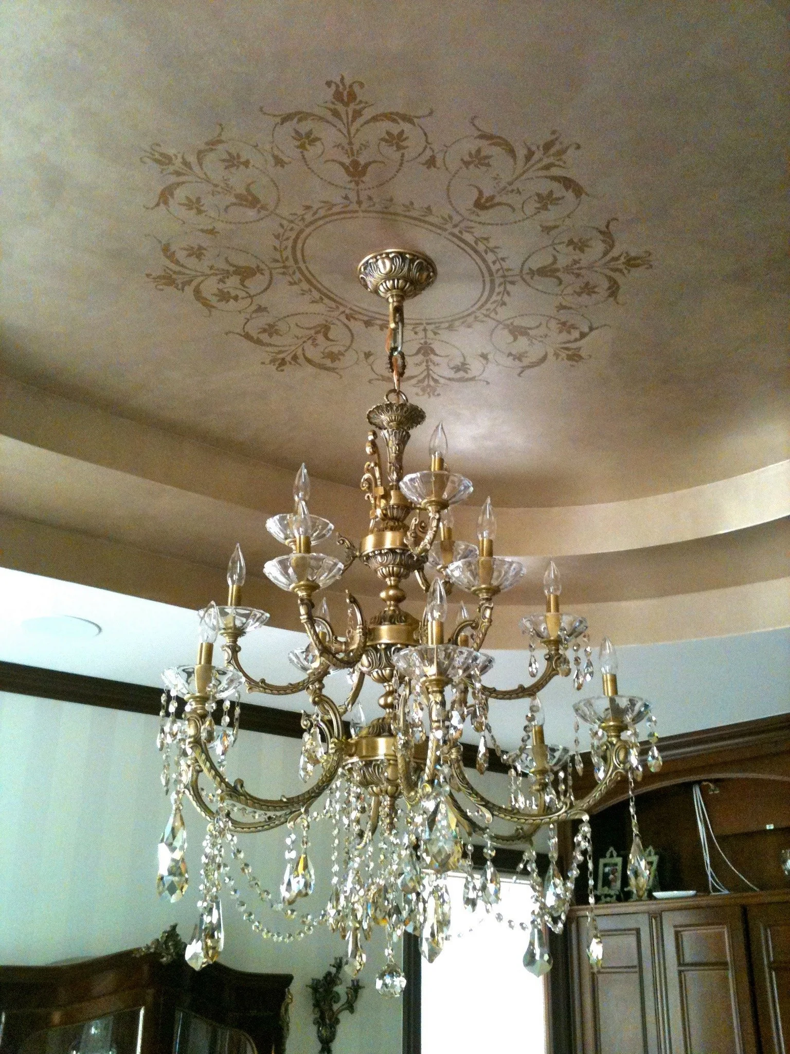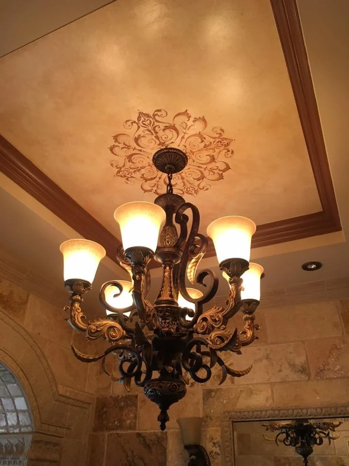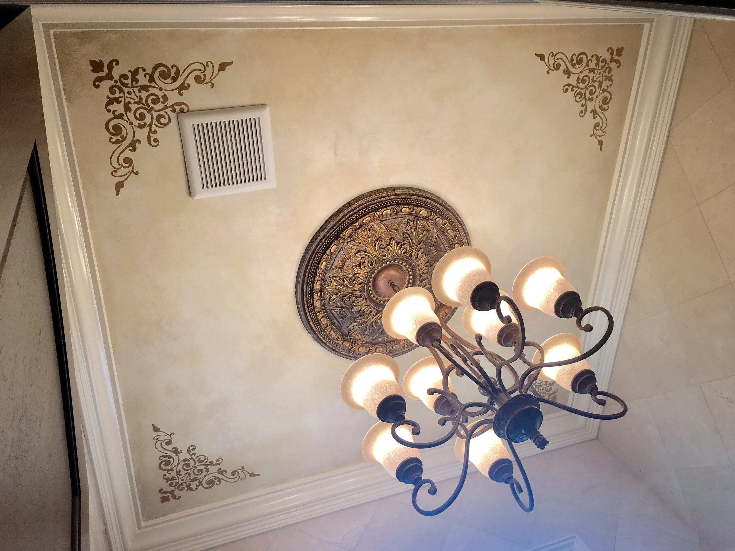 Ornate corner stencils done in bronze metallic on subtle faux glaze gives this ceiling an extra "wow"