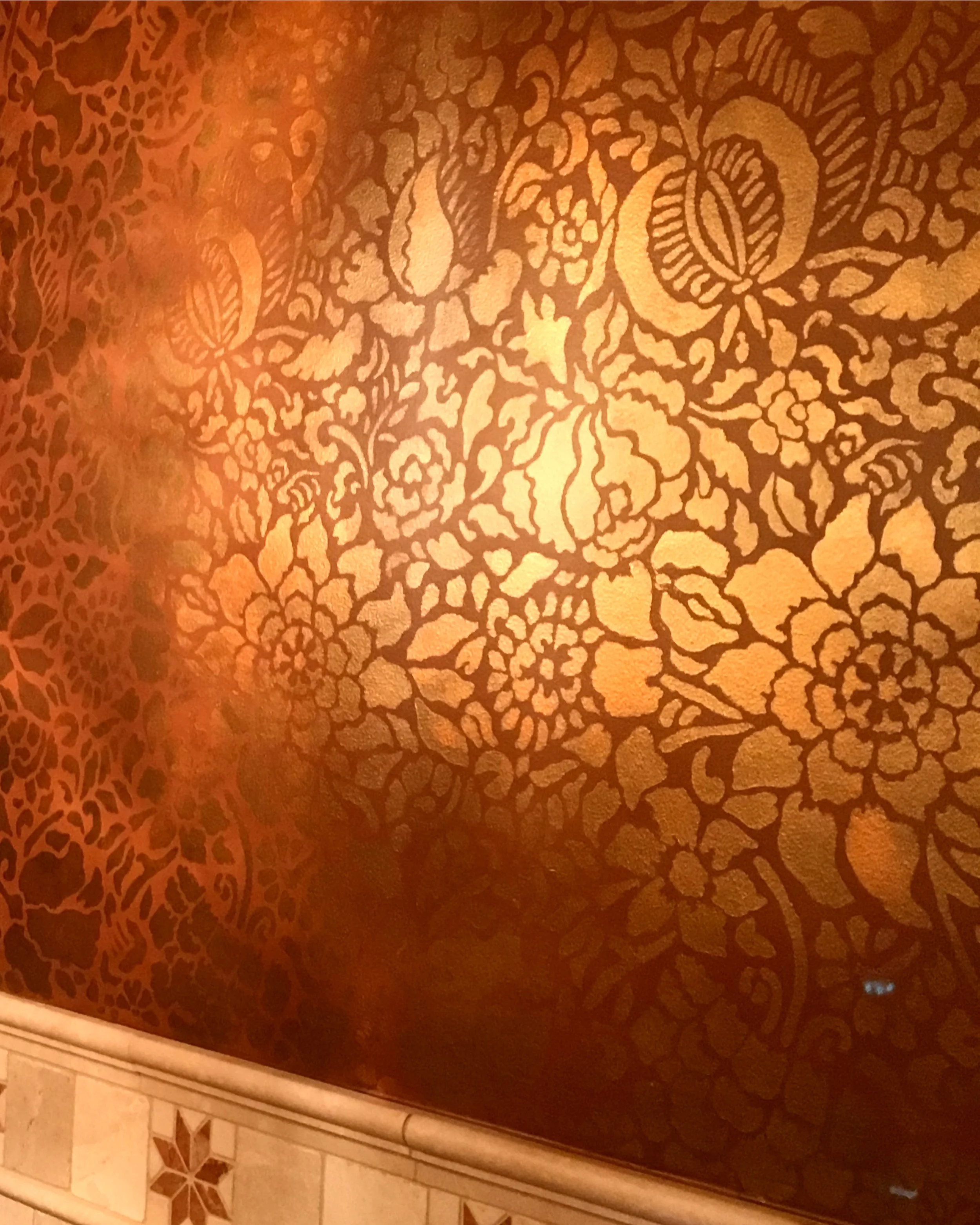 Ornate medallion stencil done in a rich bronze metallic over a gold metallic faux finish