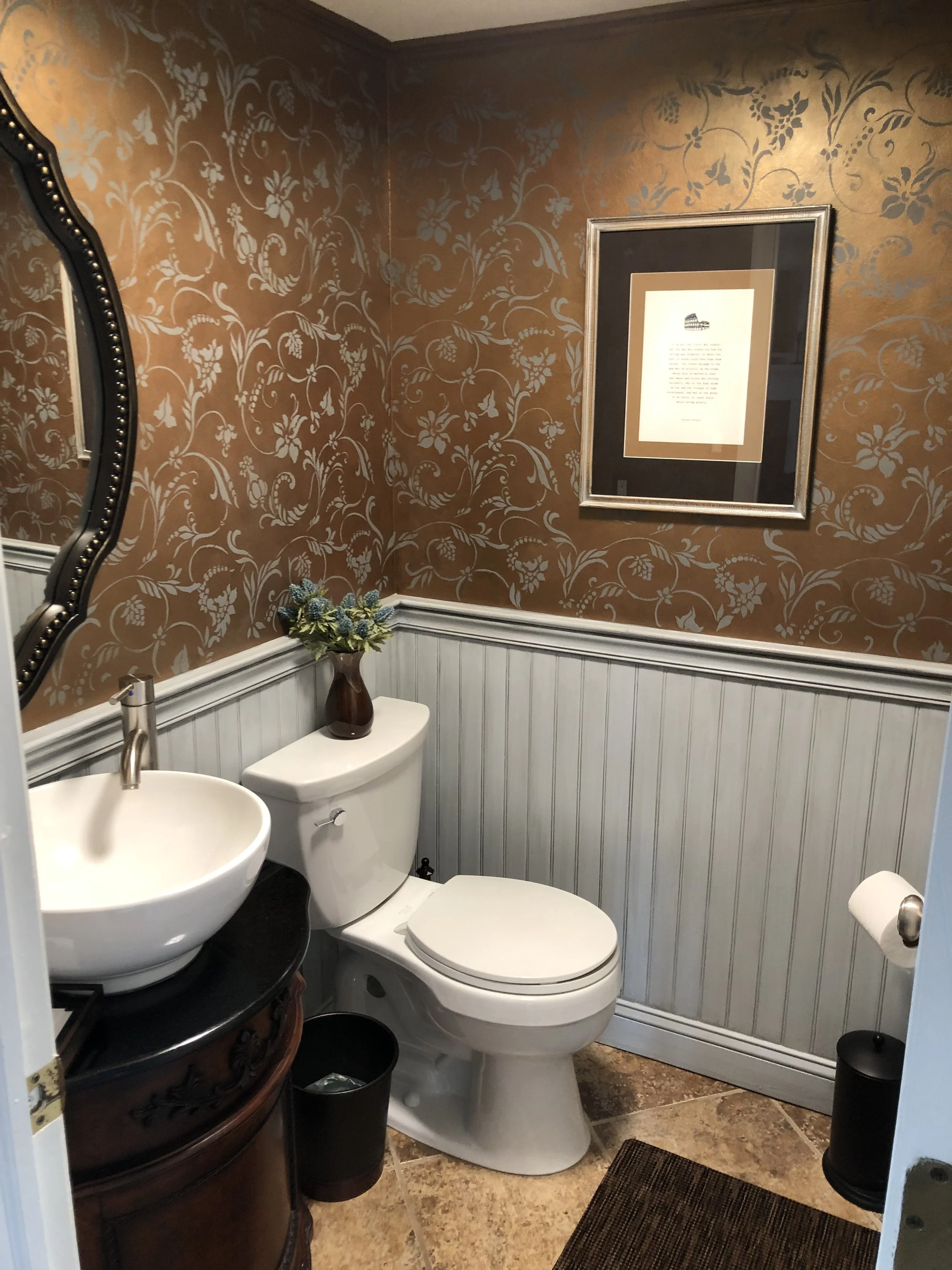 Floral stencil done in soft blues on copper metallic faux finish gives the look of wallpaper with out the seams!