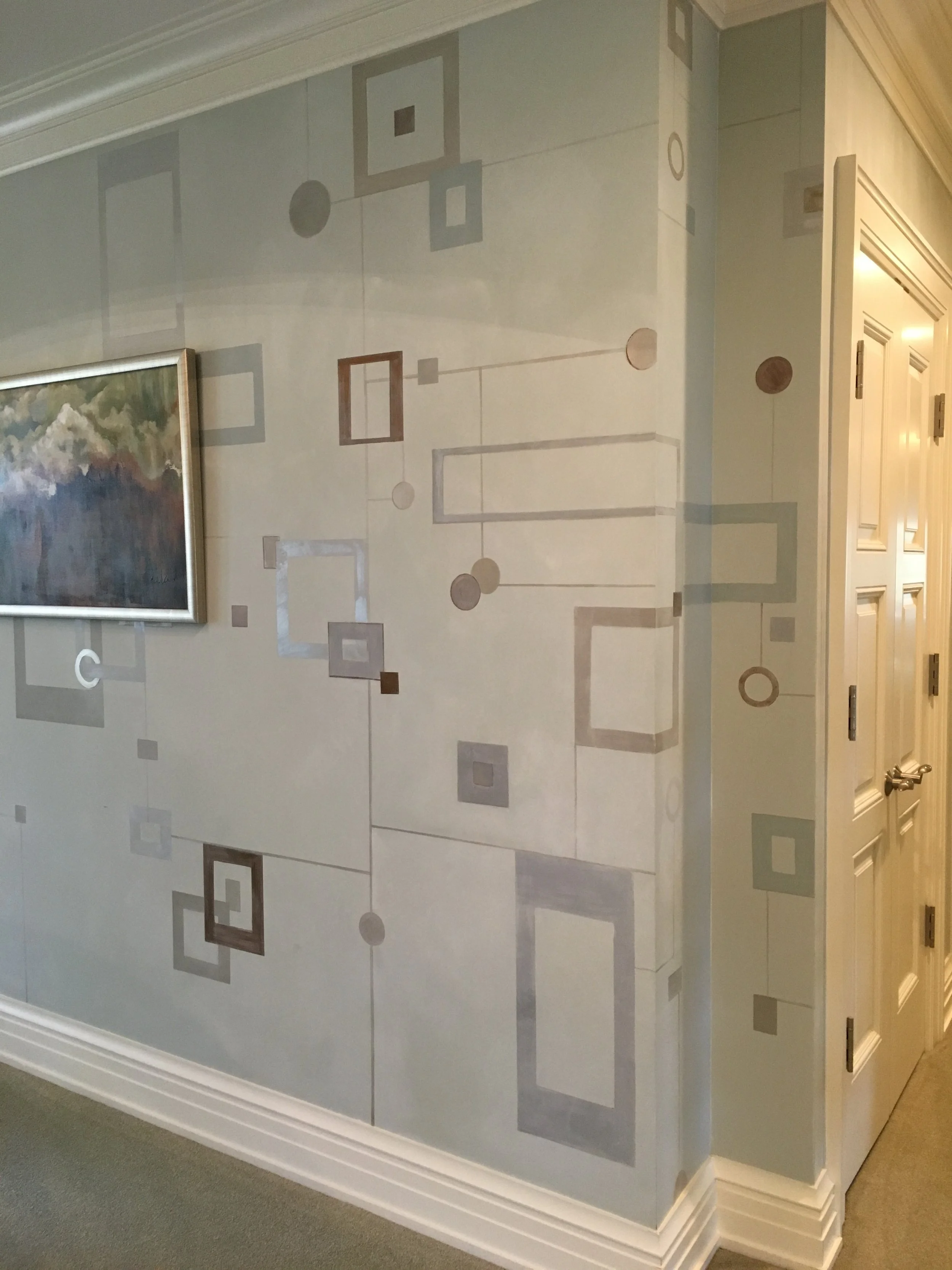 Custom geometric stencil in multi metallic finishes give a whimsical accent to a contemporary home hallway