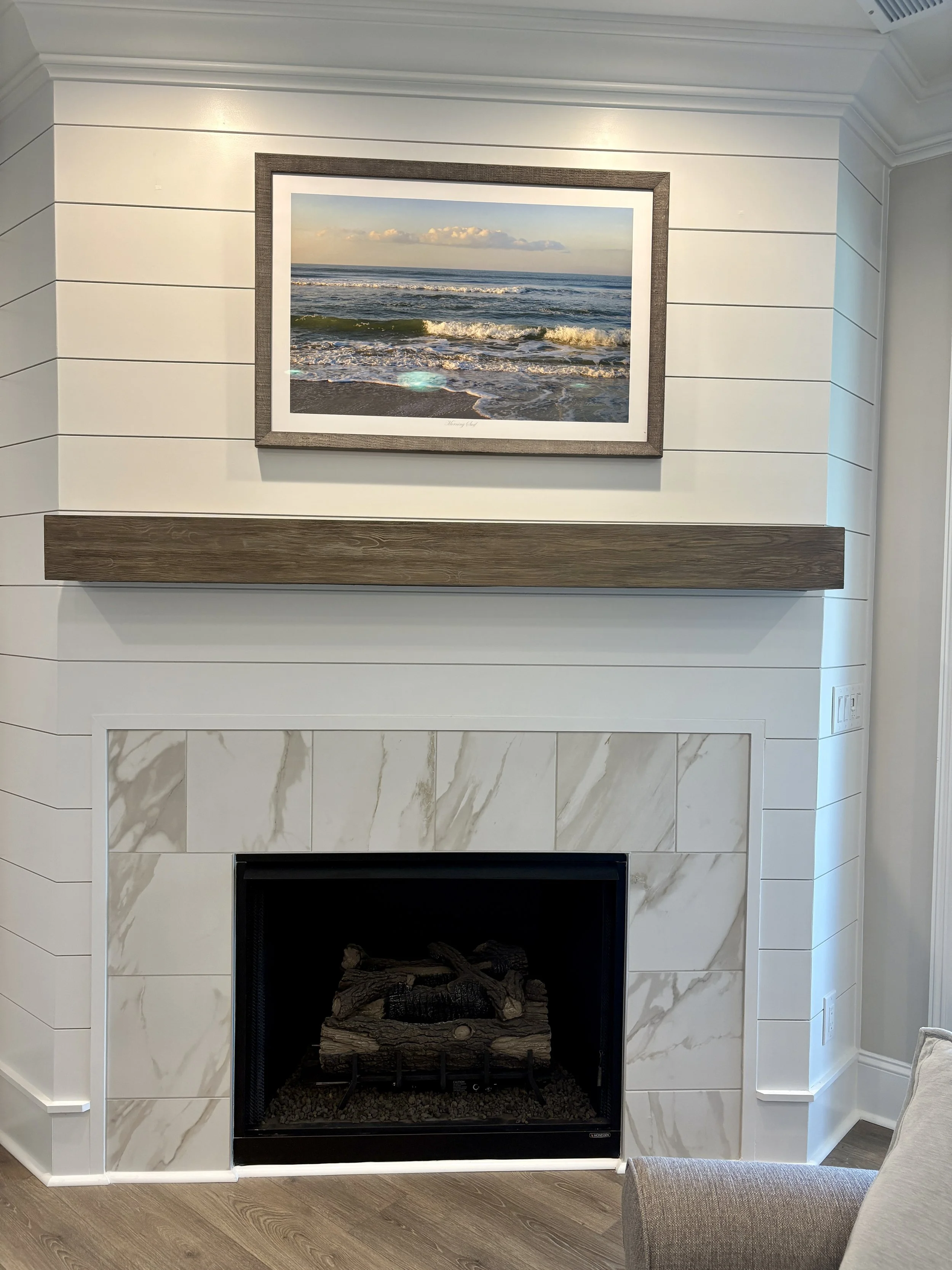 Fireplace mantle faux grained with bronze metallic accent painting on trim & carved corbels.