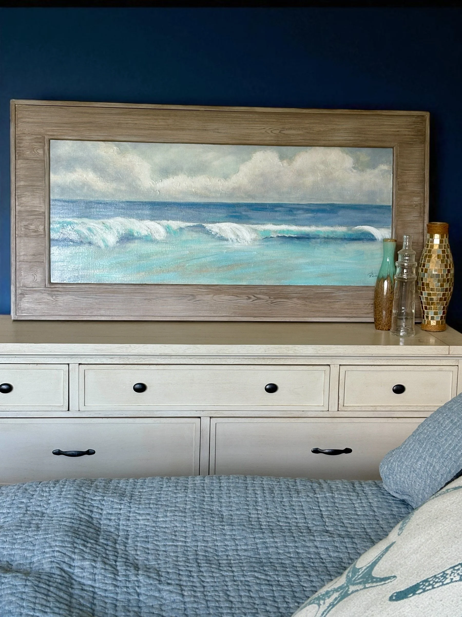 The existing white frame didn't work well with the off white furniture; a faux grain look gave this coastal painting the look it needed to go perfectly with bedroom furniture.