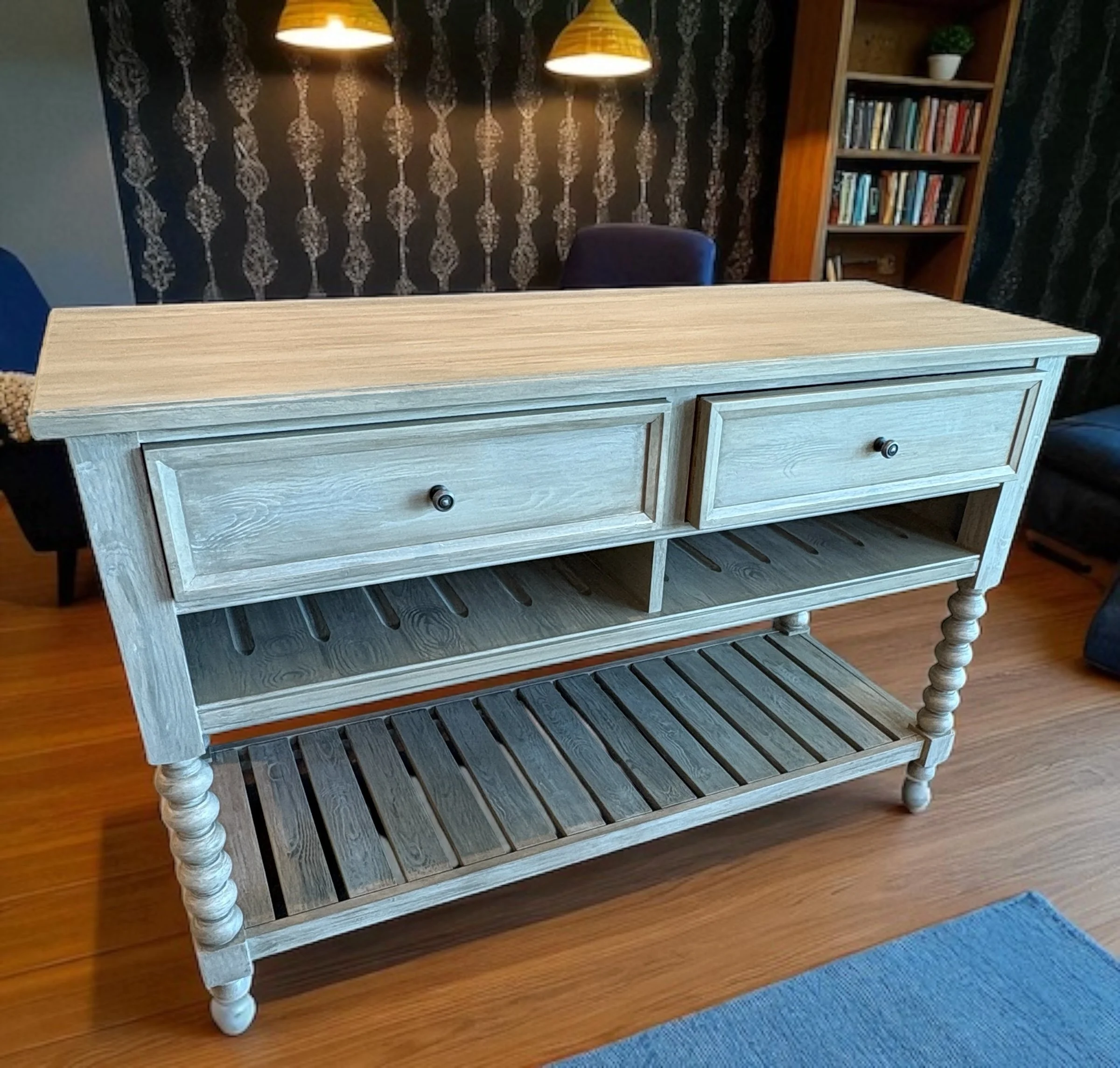 Dated pine cabinets painted in linen white with dry brush technique. The dark grey island also in dry brush offers a wonderful contrast in newly decorated kitchen.