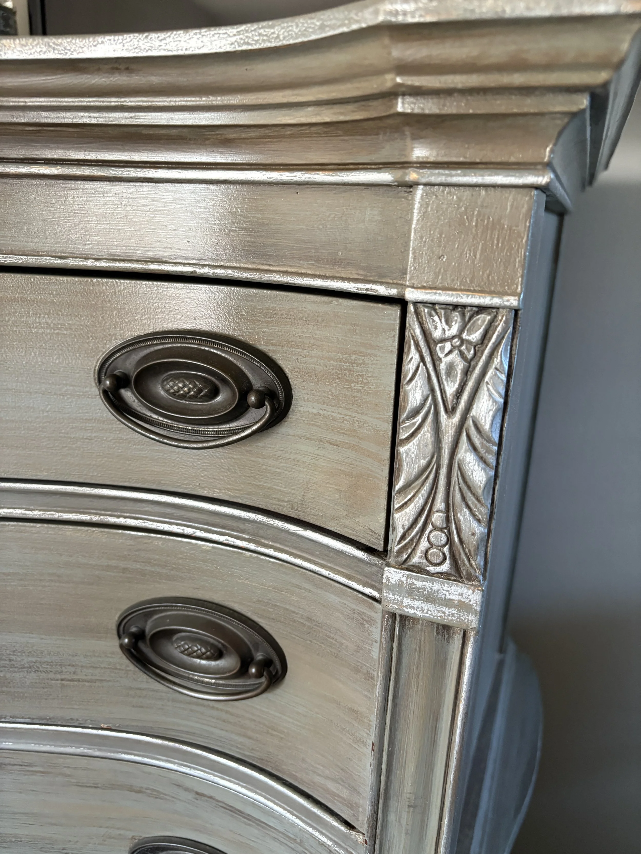 Worn wooden vanity painted in a grey custom color & embellished in dry brush technique with silver accent painting. What a great idea to transform a piece of furniture into a custom vanity!