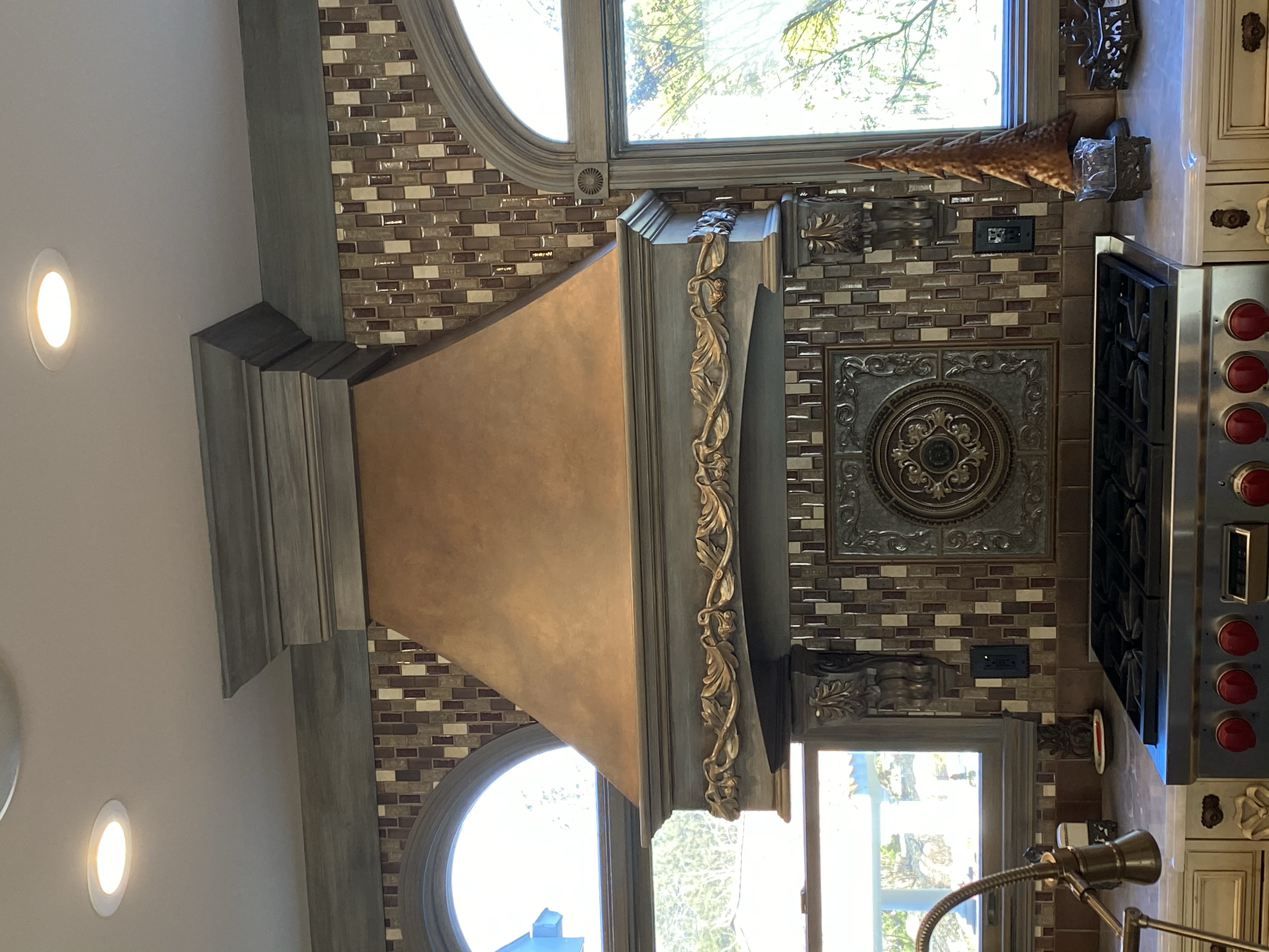 White stove hood transformed with copper metallic finish, glaze effect & bronze metallic accent embellishment on scrollwork!